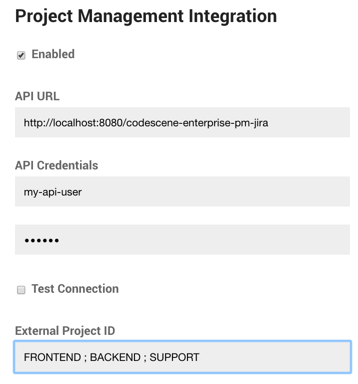 The base URL of the PM integration service. If you have deployed the JIRA integration in Tomcat, the URL will likely be http://localhost:8080/codescene-enterprise-pm-jira.