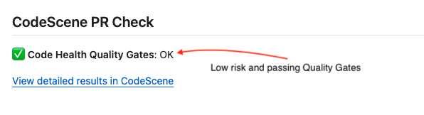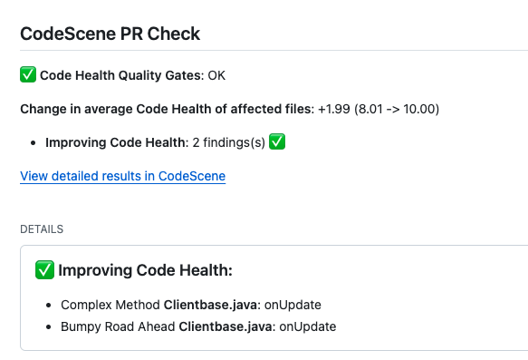 Fig. 126 An example on CodeScene’s quality gates where Details contain actionable feedback (example from CodeScene’s GitHub integration).¶